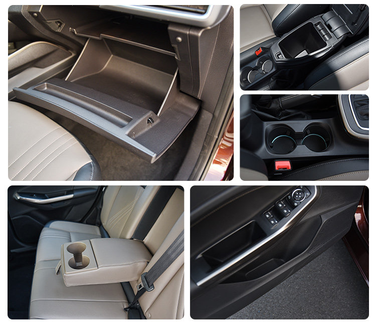 福睿斯车内的储物空间非常丰富,前后四个杯架,中控台下还有一个储物格,可以放置钱包和手机。中央扶手箱的深度足,副驾驶手套箱的空间中规中矩。