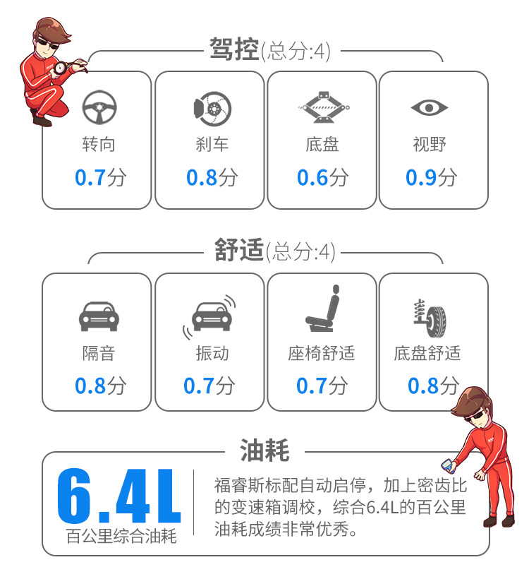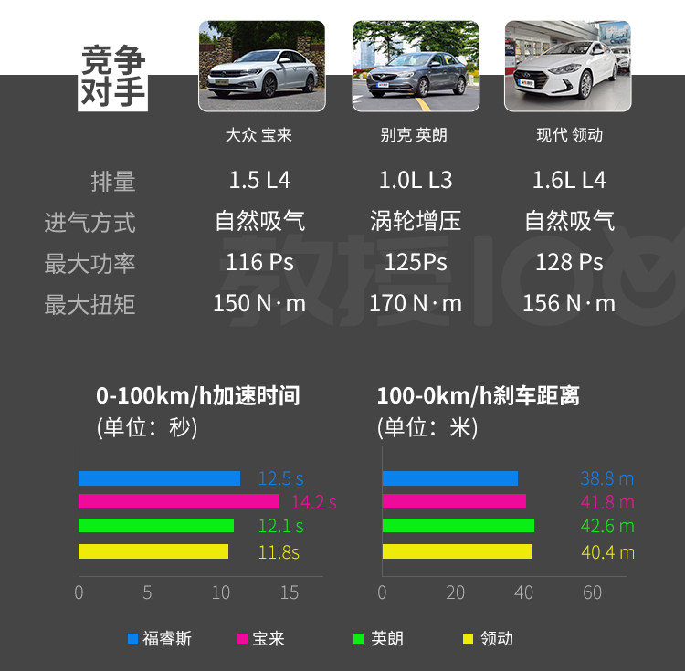 新福睿斯的百公里加速时间为12.5秒。在同级中处于主流的水准。福睿斯的6AT变速箱齿比比较密,破百需要4挡,拖了加速的后腿。但是密齿比的设定可以让福睿斯在常用的速度区间里尽可能地降低转速,使得发动机处于更高效的运动区间,换句话说,就是更节油。对于一款家庭用车的用户来说,百公里加速快一秒还是百公里少一升油更贴近他们的需求?我相信多数人的选择是后者。