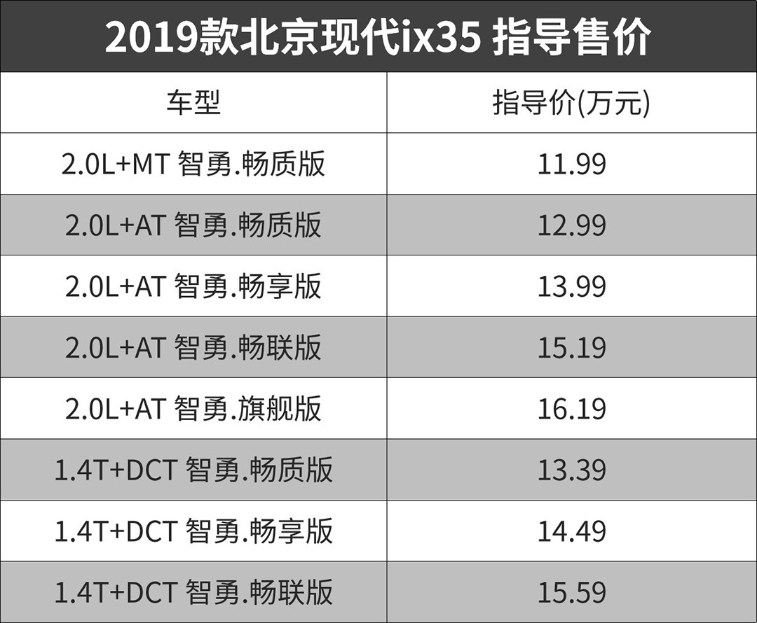 日前,2019款ix35正式上市,售11.99-16.19万元。新车保留了老款2.0L的5款车型,同时新增1.4T的3款车型。新车的外观与内饰与现款保持一致,主要针对配置升级,包括全系将标配发动机启停等,进一步为消费者提供更多便利。动力方面,新车提供2.0L发动机或1.4T发动机选择,最大功率分别为160马力和140马力,峰值扭矩分别为193牛·米和242牛·米。传动方面,与2.0L发动机相匹配的是6速手动变速箱或6速手自一体变速箱;而与1.4T涡轮增压发动机相匹配的是7速双离合变速箱。现代ix35在国内有不俗的表现,此次增配上市,无疑将进一步助力其销量增长。