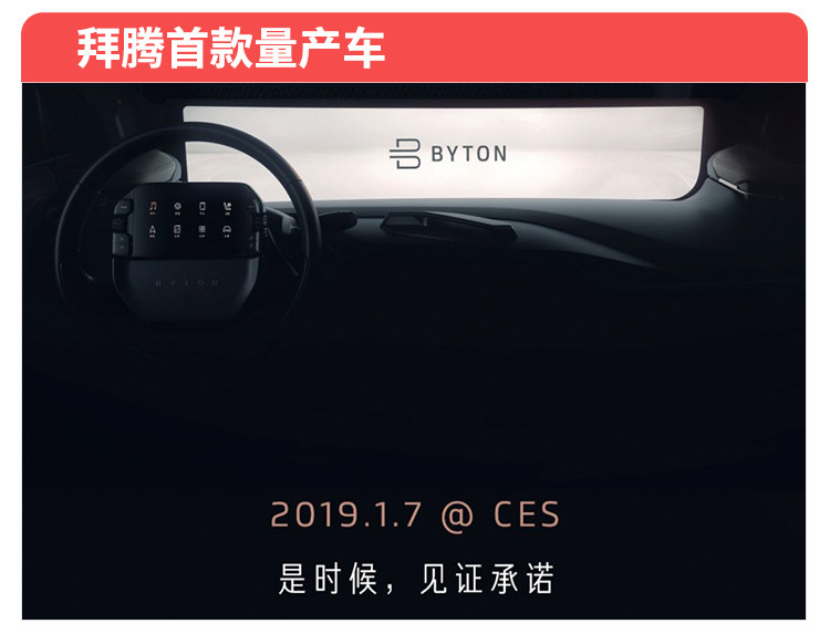 教授点评:在2018年1月的CES首次亮相的BYTON拜腾旗下首款概念车,至今令教授难忘;尺寸超大的中控屏横贯整个中控台,还提供了多项先进、智能人车交互功能;创新的产品理念更令它与一般新能源车不同。2019年初,同样是在CES国际消费类电子产品展览会上,拜腾的首款量产车将正式亮相。从预告图中,我们可以看出,新车在内饰方面将保留着大尺寸贯穿式设计,而屏幕下方的传感器和传统物理按键布局有了进一步的完善。其他更多的消息则需要等待官方正式公布。