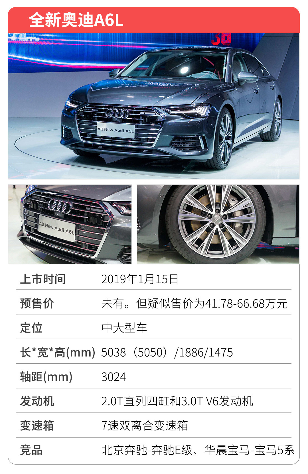 教授点评:全新奥迪A6L已在18年广州车展进行亮相。新车与海外版设计基本相同,前脸将横向拉伸的视觉效果体现得更为明显,整车保持了商务行政与运动时尚相结合的气质。内饰利用了双屏幕的设计向奥迪A8L看齐,科技感十足。轴距进行了加长处理,进一步满足中国市场需求。动力方面,将采用2.0T发动机,提供高低功率两个调校;还有3.0T V6发动机,给动力需求更高的消费者选择。