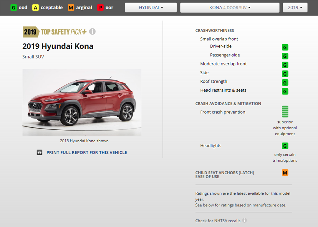 KONA就是国内的现代Encino昂希诺,或许是车型过于激进,也或许是车型名称拗口?此前备受众望的昂希诺在华销售却是水土不服。不过其在IIHS测试中则可以是一支独秀,根据国内车型尺寸标准,它可是唯一一款获得TSP+的小型SUV。在各碰撞测试中均获得了最佳的”优秀”(Good)评价。碰撞预防方面则是获得了“极佳”(Superior),可以选择主动安全配置,仅仅是儿童座椅易用度获得了“中等”成绩。在国内,其除最低配均可选配主动安全配置。