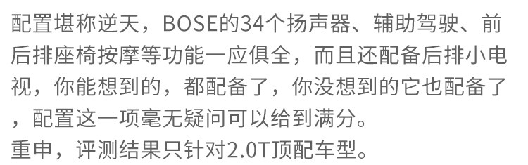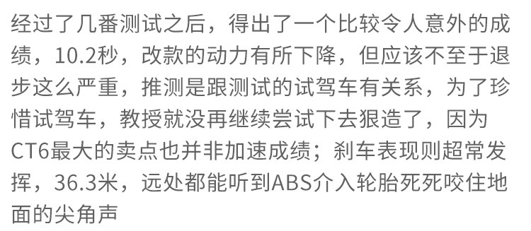 后轮转向是值得点赞的一个地方,而且CT6还是后轮驱动的,尤其是在时速70-80km/h甚至往上的时速区间,这可是5.2米的车,变道却极其灵活,让这1.8吨的车完全不像个大胖子,能感觉到车身尾部的姿态要比车头还要活跃,但不太适合激烈的开,因为虽然后轮很灵活,但前轮,车头的指向性可不像宝马,不过话说回来,CT6要展现的是豪华,而不是操控,后轮转向只是为日常驾驶提供更好的体验而服务的,而不是提升操控性运动性的。