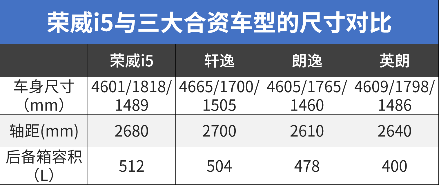 不同外观之下,车身尺寸成了衡量车内舒适的重要标准。以上的图表对比中,四大车型的纵向尺寸相差不大。但在横向空间上,宽度达1818mm,令荣威i5在着天生的优势,舒适性更高。除此之外,在后备箱的负载能力上,荣威i5的表现也很突出,该款车型有着512L同级别最大的后备箱空间,后备箱装载能力更强。
