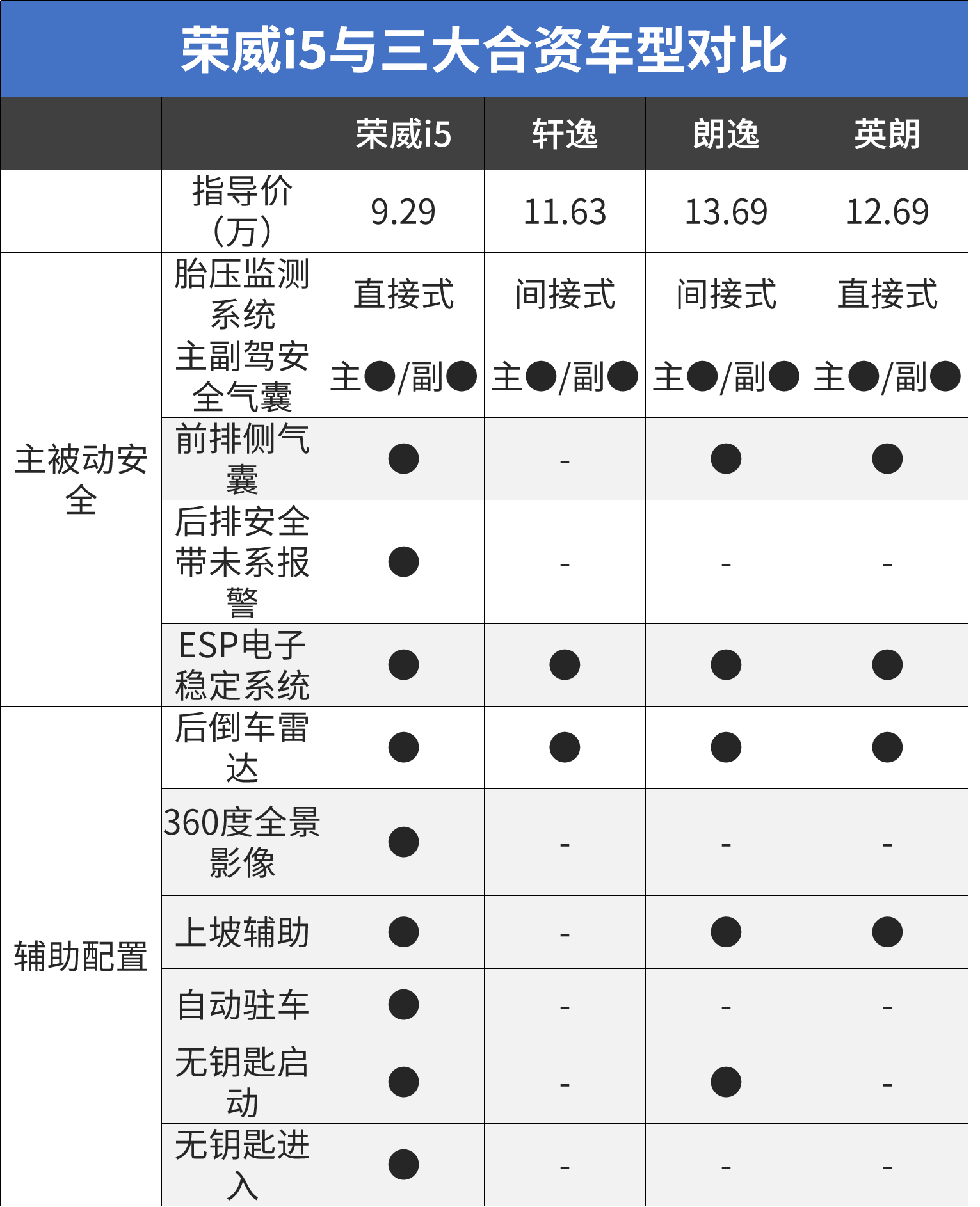 可以看出,三者车型在主动安全性方面上,整体的差距并不大。但荣威i5在细节方面更加细腻,比如直接式的胎压监测系统、集12项功能为一体的ESP系统、后排安全带未系报警系统等。而日常的舒适性配置,有360度全景影像、后倒车雷达、上坡辅助、自动驻车、无钥匙启动、无钥匙进入等配置,丰富且实用。