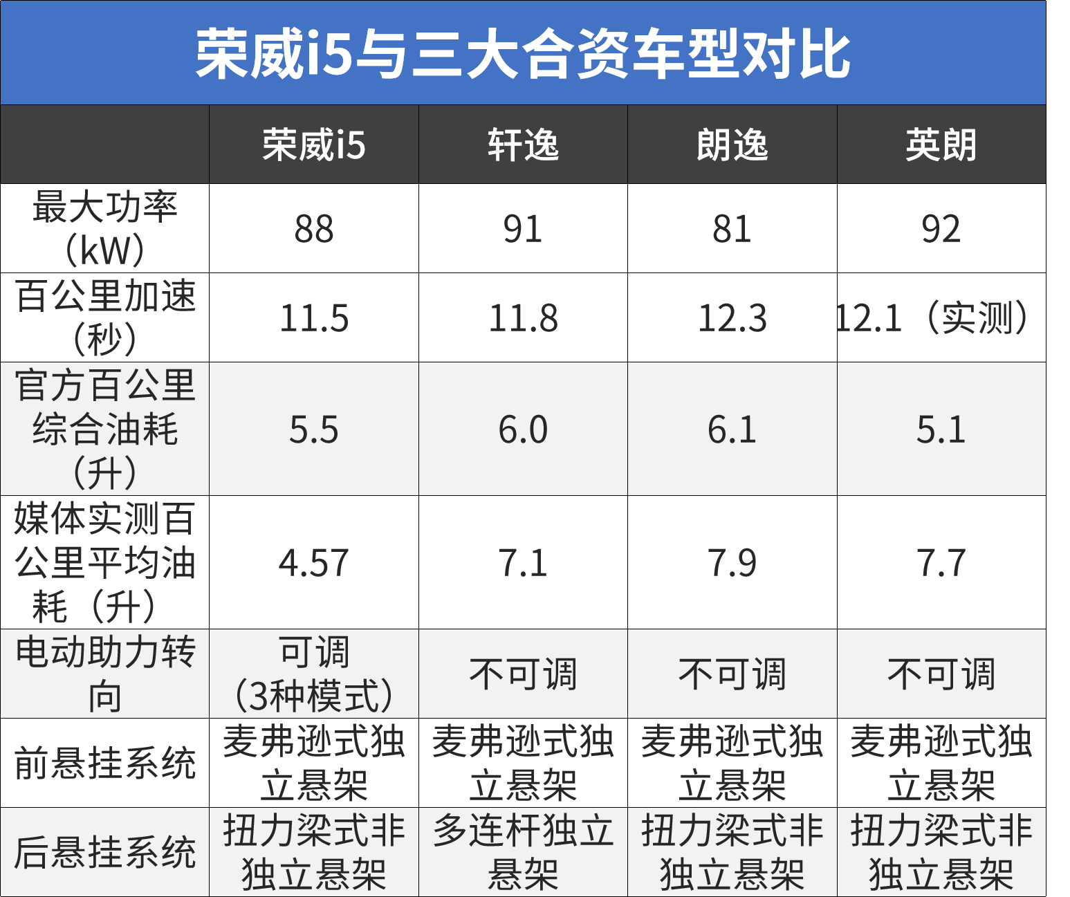 在众多专业媒体八仙过海各显神通地实测中,荣威i5实测百公里平均油耗成绩喜人,仅4.57升。相比英朗7.7升,朗逸的7.9升、轩逸的7.1升实测百公里油耗成绩,优势突出。动力性能有些优势的前提下,荣威i5油耗表现也不赖。
