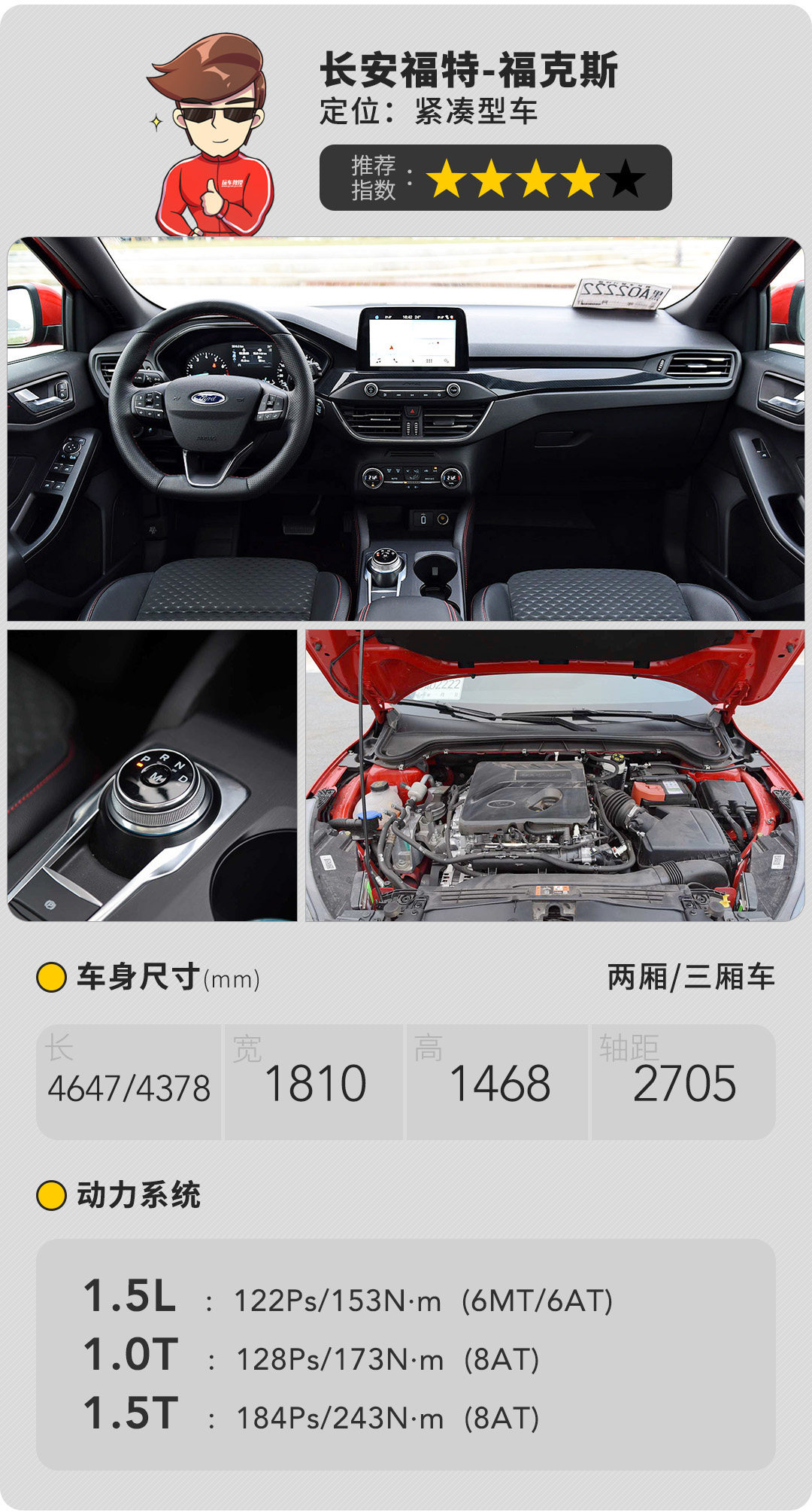 福克斯从内到外都彻底进行了升级,全新的内饰十分耐看,8英寸的悬浮式中控屏、布局清晰的物理按键、旋钮式换挡机构,这些元素加起来赋予了福克斯简约耐看的一套内饰。作为需要顾及家用的车,全新福克斯在尺寸上有全面的提升,更大的尺寸让福克斯的后座不再是备受诟病的地方。内饰、尺寸的提升无疑提升了福克斯作为家用车的竞争力,但除了家用以外,全新福克斯的操控同样值得称道,真正做到家用运动两不误。