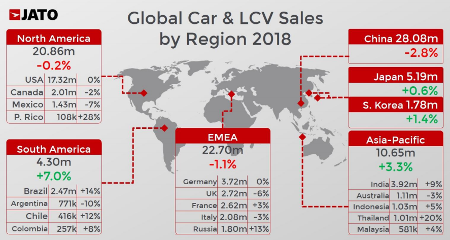 业内知名的市场调研机构 JATO Dynamics,近期对外公布了2018年新车销量报告。去年全球汽车销量超过8600万辆,由于中国和美国两大汽车市场增涨乏力,导致整体销量出现小幅下滑。印度、巴西和俄罗斯等国家新车销量大幅提高,去年印度取代了德国,成为全球第四大汽车市场。