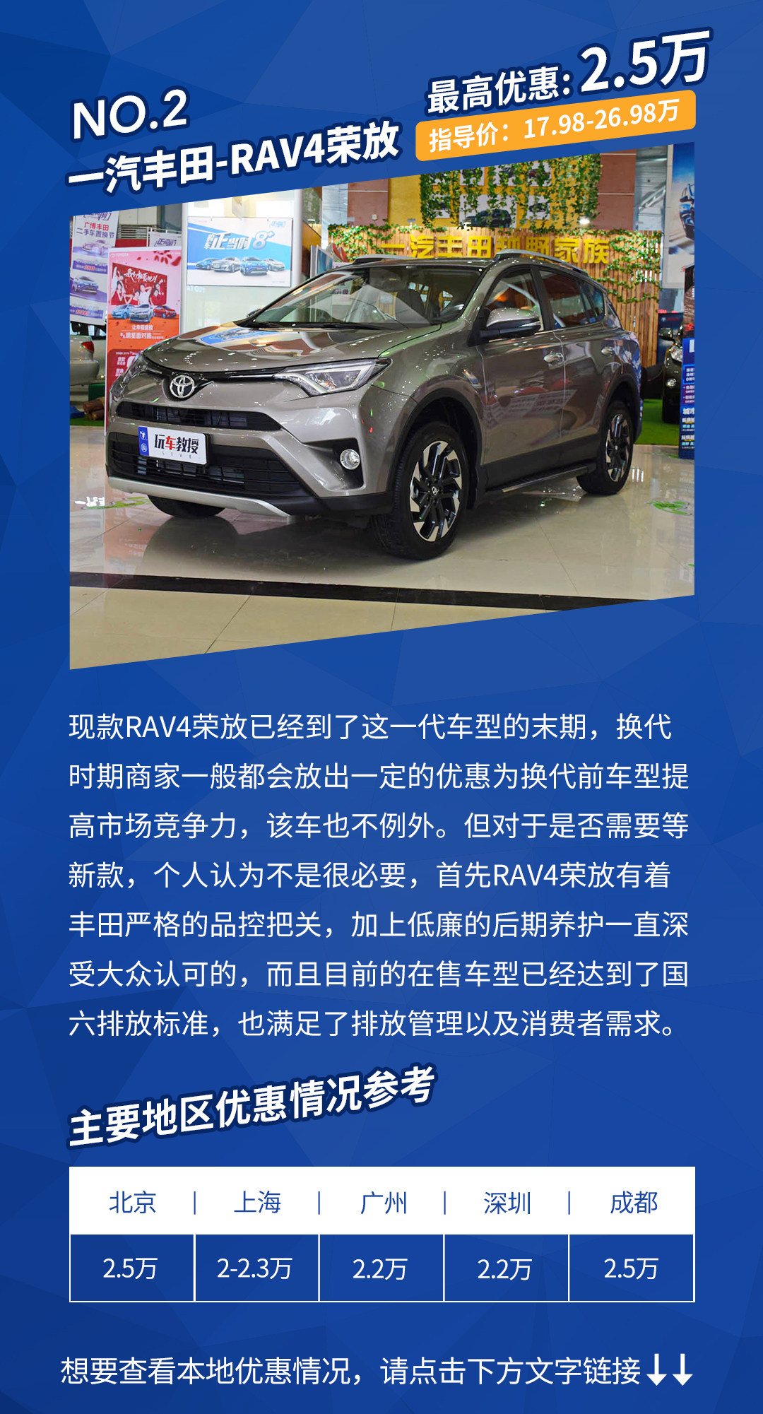 相较于车辆原有的空间、配置、动力等方面表现,在售价上给出优惠确实更能够刺激消费者的购买欲。以上这几款车给出的终端优惠力度都比较大,其中不乏高尔夫、威朗、RAV4这类拥有超高市场口碑的车型,而RX5和领动本就有着价格上的优势,优惠过后性价比也变得更高,而探歌上市时间已有半年,终端放出优惠后必然能吸引更多感兴趣的消费者。