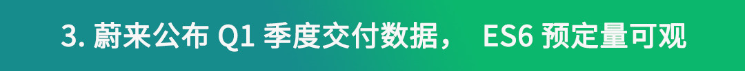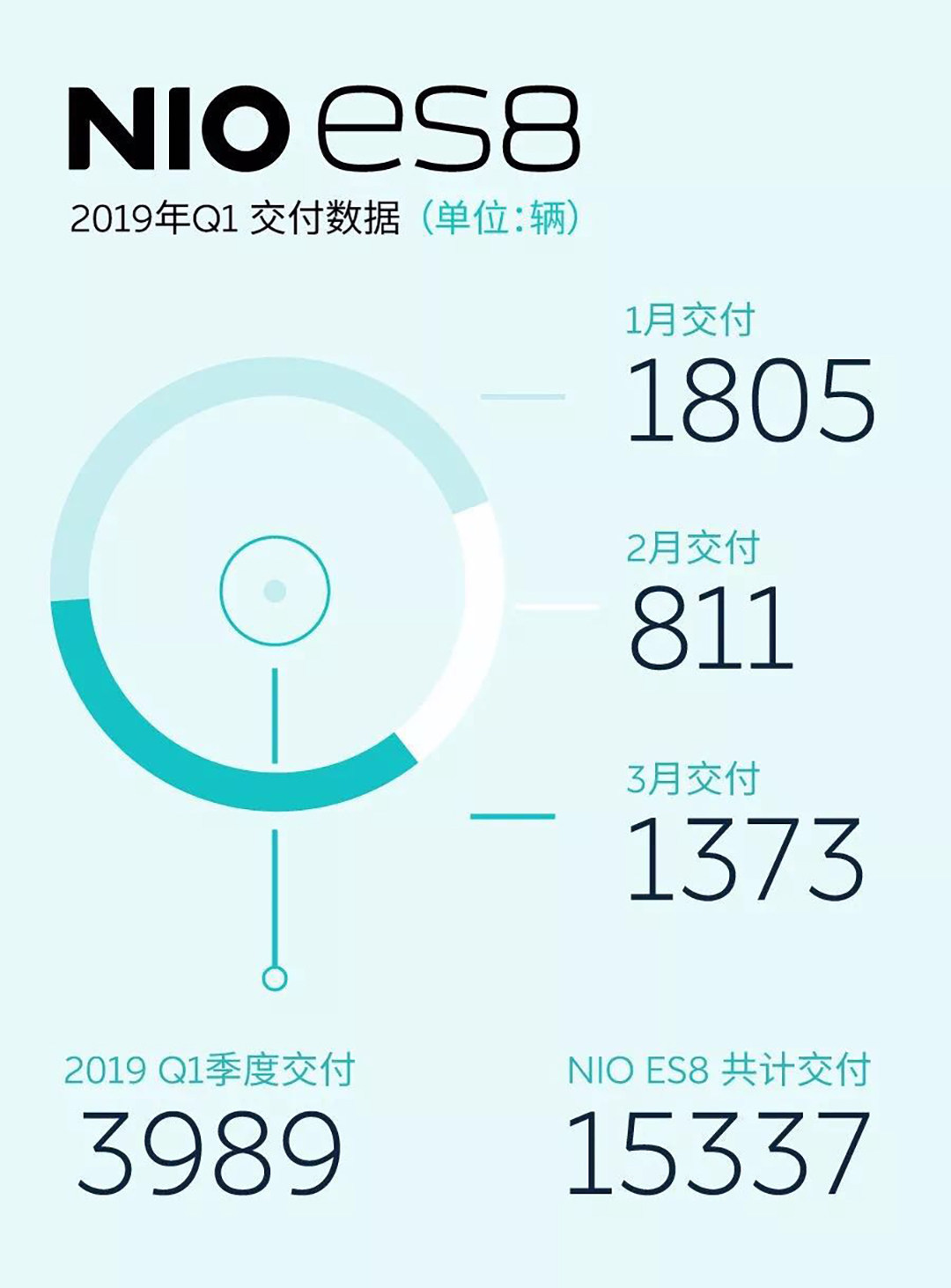 4 月 2 日蔚来汽车正式公布了 2019 年 Q1 ES8 的销量,一月交付 1805 台 ES8,二月交付 811 台,三月交付 1373 台,Q1 累计交付 3989 台,ES8 累计交付 15337台。