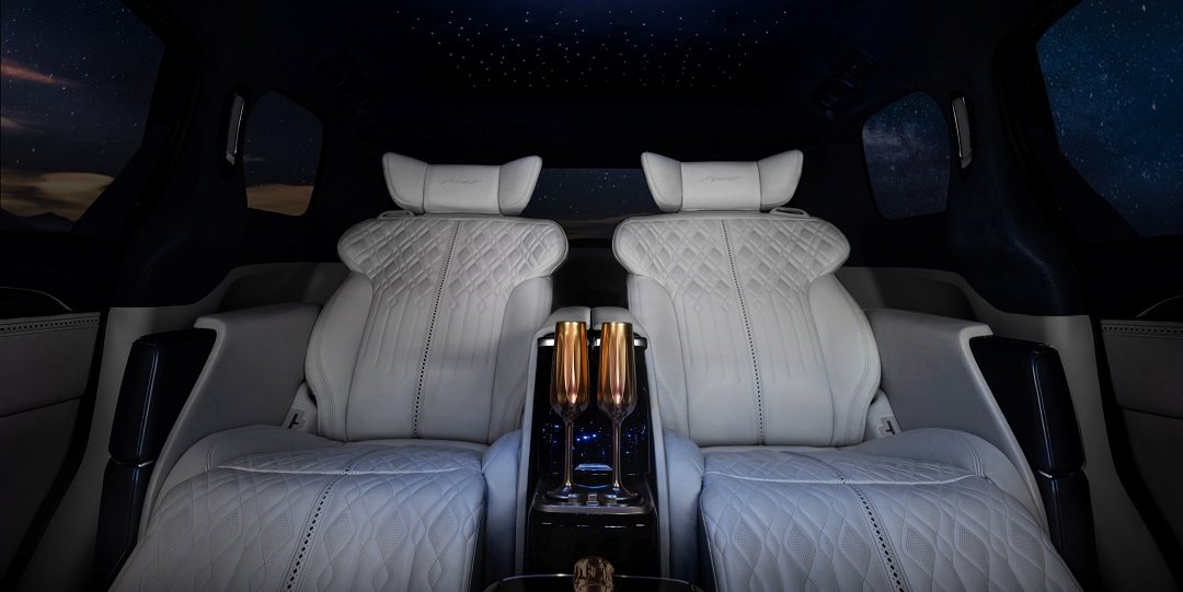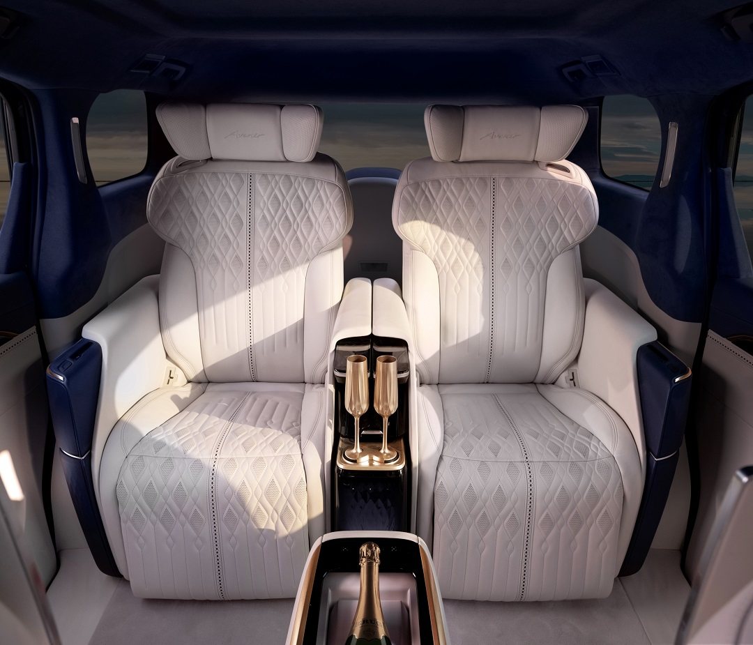点睛之笔在于【仪式感】,当按下控制按键,前排扶手箱会向后排方向滑移,打开琉璃镶板送出红酒,配合后排中央扶手下层滑移出的Avenir定制中控酒柜,两只Avenir金色的定制后排中控酒杯缓缓升起,这帝皇级的尊贵仪式感,绝无仅有。