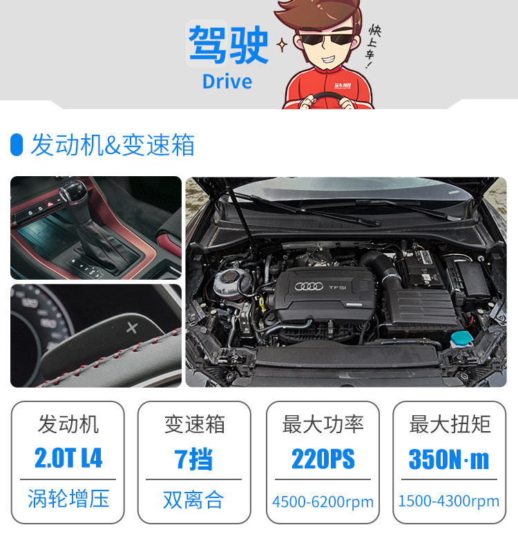本次测试车型为奥迪Q3 2019款 45 TFSI quattro 豪华动感型 ,搭载了国VI排放标准的高功率EA888(DBR)发动机,传动方面匹配进一步调教过的7速S tronic双离合变速器。
