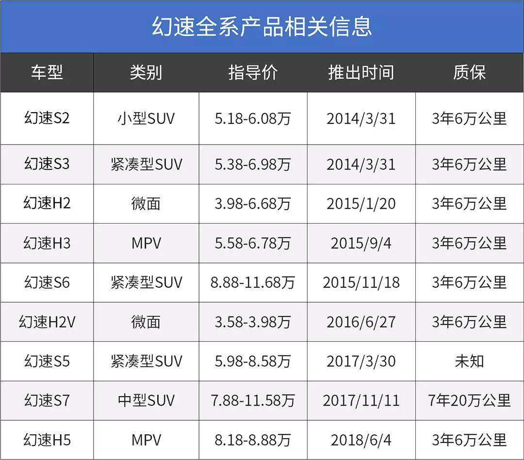 随后幻速推出了H2/H3/S6等多款车型,销量也逐年攀升,到2016年时幻速的年销量已经达到了26.7万台,截至2018年底,幻速在售车型多达9款,产品类型涵盖了微面、MPV、小型SUV、紧凑型SUV以及中型SUV等多类;然而虽然销量足够大,但是幻速车型的质量却一如初期产品那么不尽如人意。