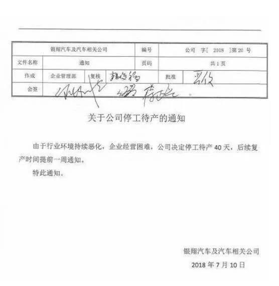 其实早在2018年7月10日,银翔汽车便曝出了停工待产通知,当时决定停工待产时间为40天,但是时至今日银翔汽车依然没能恢复生产。