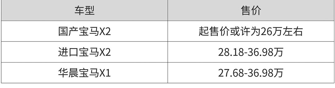 宝马X2自然有着足够的自信直面奥迪的挑战,但是基于宝马的品牌定位和X2的个性形象,预计宝马X2尽管正式国产,起售价格或许也不会低于26万。虽然在众多人心目中宝马X2的真正对标车型应该是奥迪Q2L,但是反观以空间见长、对标Q3的宝马X1,官方指导价同样也在27万出头,因此更为个性的宝马X2的价格自然也不会掉落到奥迪Q2L那般22万以内的水准。