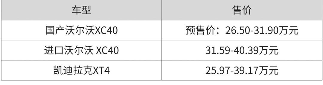 国产沃尔沃XC40已经十分接近正式上市(上市时间就在5月24日),预售价格26.5万元起售的价格也处于跟奥迪Q3同样的水平。按照惯例,正式上市后的价格通常而言会比官方预售价略低,因此全新的XC40的正式售价有望跌破26万元,如若成真,届时它也将会在指导价层面比凯迪拉克XT4更有竞争力的一款车型。