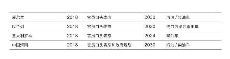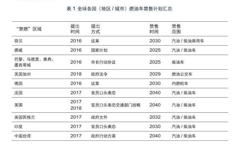 2018年,美国加利福利亚州、爱尔兰、意大利罗马和西班牙等国家(地区)也对禁售燃油车的时间表进行了表态和规划的公布。