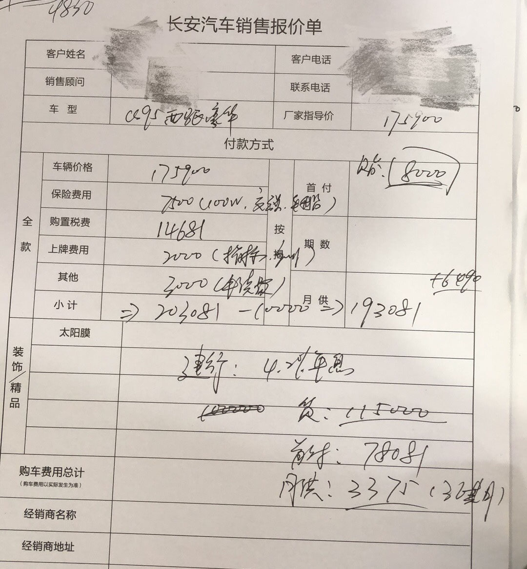 了解了所有的情况之后,教授让两位销售顾问列出这款车型购买的具体费用。虽然广州明恒昕4S店也算出了相关具体费用,但询问是否可以拍照回去商量的时候,销售明确表示不可以。教授表示记住了首付大概多少,可是过了一两天,又忘记了,想必大多数消费者遇到这种情况,也是这样吧。而另外一家,则是允许拍照作为参考。从表中可以看出,如果选择豪华版的话,整体的落地费用大概在193081元左右。而选择常规的30%的首付,分36期的话,减掉贴息费用,首付大概在78081元左右,每月月供为3375元左右。