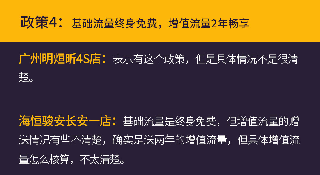 教授分析:从两家经销商给出的反馈来看,对于流量赠送的具体细节并不是太清楚。由于有些版本车型搭载全新in Call智能车载互联系统,足够的流量还是很有必要性的。再根据官方宣布的政策中可以看到,精英版作为标准配置,没有搭载in Call智能车载互联系统,所以在流量方面的优惠政策是享受不到的。