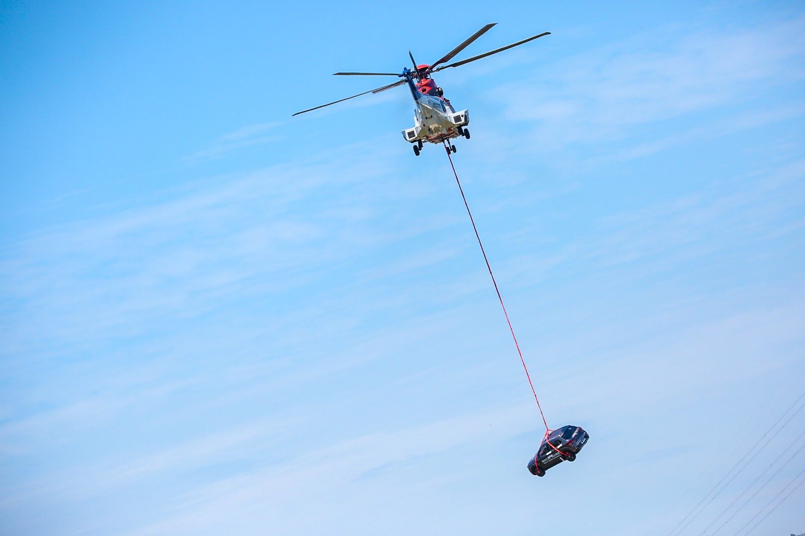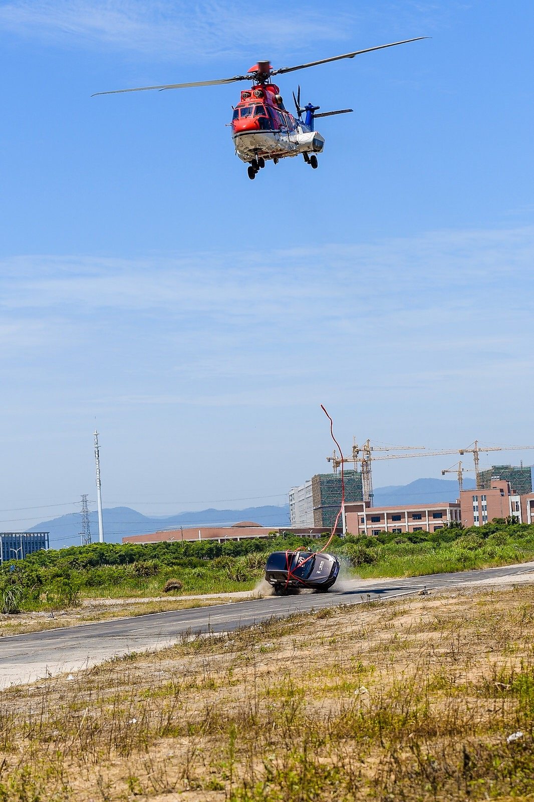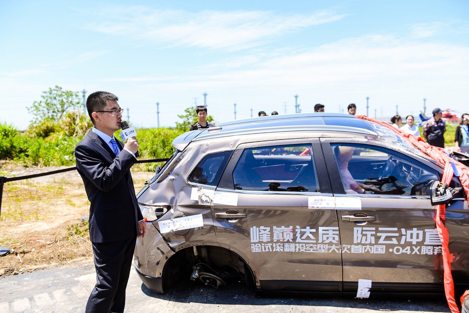 试验中,由直升机悬挂车辆,以120km/h左右的速度,从空中直接抛向地面,翻滚路径为左前轮着地,沿侧面翻滚,不过整个过程中车辆未受到正面撞击。