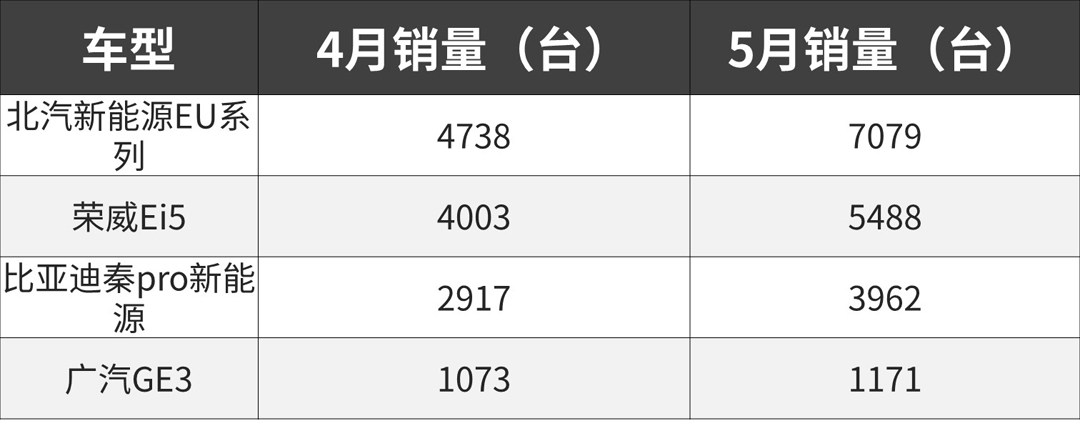 由于补贴退坡日期越来越近,使得有意购买新能源车的用户在退坡之前纷纷入手,使得新能源车市场在近两个月有病态式的增长,例如销量最高的北汽新能源EU系列,4月份销量仅为4738台,而5月份临近6月份补贴退坡之际,直接跃升到7079台;荣威Ei5从4月份的4003台跃升至5488台;比亚迪秦pro新能源从2917台跃升至3962台。虽然增长的基数不大,但是对于新能源汽车来说,近千台销量的跃升是很明显的改变。