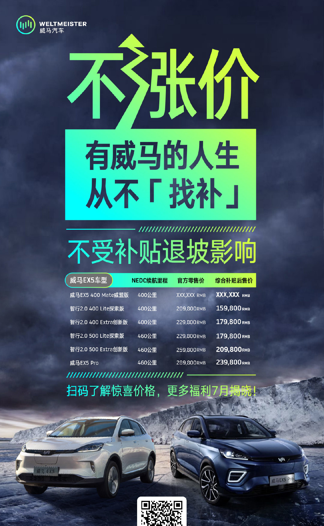 威马EX5是威马旗下首款车型,主要通过科技时尚化的外观和内饰吸引消费者,凭借补贴后售价:11.23-23.98万的指导价,俘获不少消费者的芳心,如今死守价格,威马何去何从?
