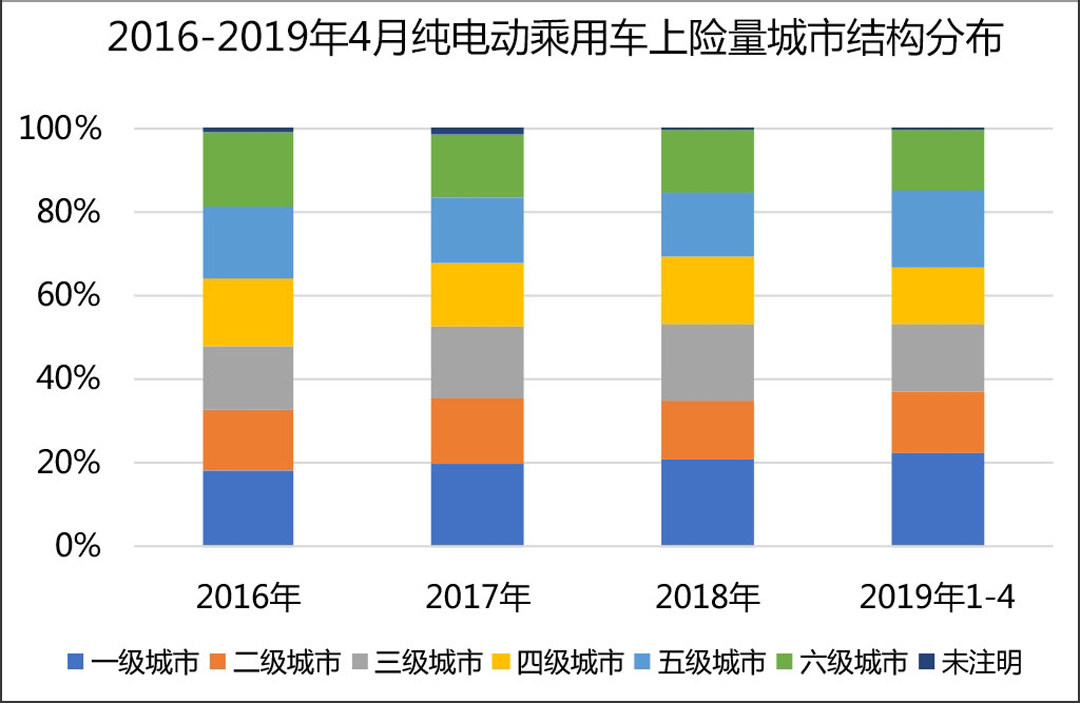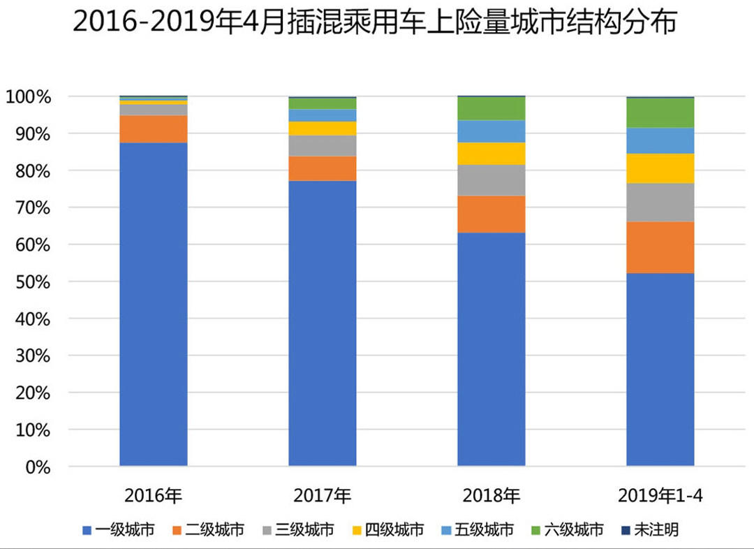 此外,新能源汽车市场逐渐从一二线城市下沉到三四线城市,根据不同的动力类型表现不同,纯电动车受政策、产品结构以及车企等调整,在三至六线城市上险量占比过高,接下来在三线及以下的城市的市场份额有可能逐步减少;插电式混合动力车而言,逐渐从一二线城市向三至六线城市渗透。对比燃油车来看,由于一二线城市市场容量有限,以及三到六线城市消费人群需求升级等原因之下,新能源汽车市场下沉是大势所趋,最终新能源市场格局将与燃油车趋向一致,这是新能源车辆逐渐从政策引导走向市场引导的其中很重要的一步。