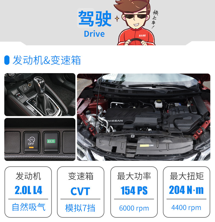 动态表现方面,在逍客身上挑不出什么毛病,发动机动力是够用的,起码在时速80m/h以上,它是很跟随驾驶者的意识的,CVT变速箱没什么“存在感”,就是平顺,但时速去到80km/h以上,再提速就会很无力了,当然考虑到毕竟排量只有2.0L,价格也是10来万,所以这并不算是什么不足。