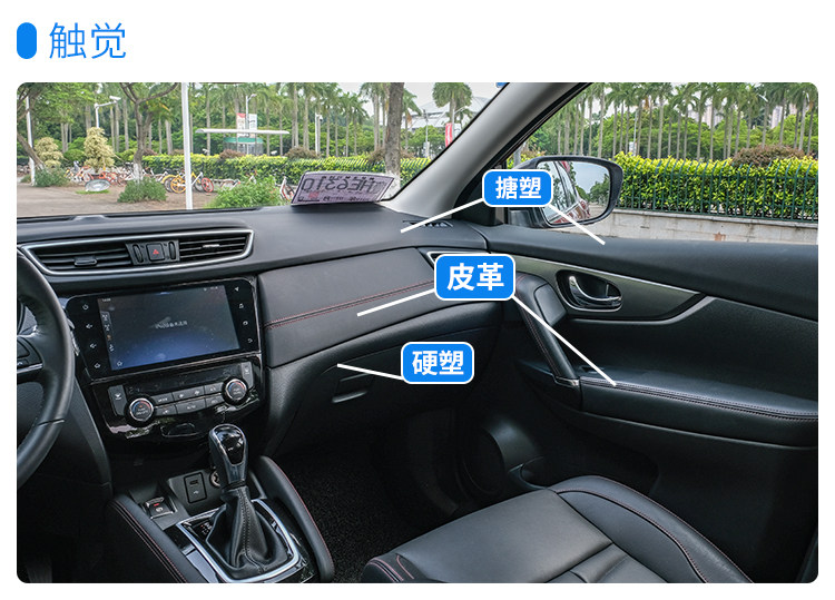 而触觉的优势则弥补了视觉的小不足,虽然整个内饰看起来都是黑色,不够居家,但是摸起来则让人很满足,中控上方的搪塑是软的,中控饰板、门板上方、扶手,就连挡把两侧都是皮革,虽然是仿皮,但摸起来手感是柔软温馨的,这点值得肯定。