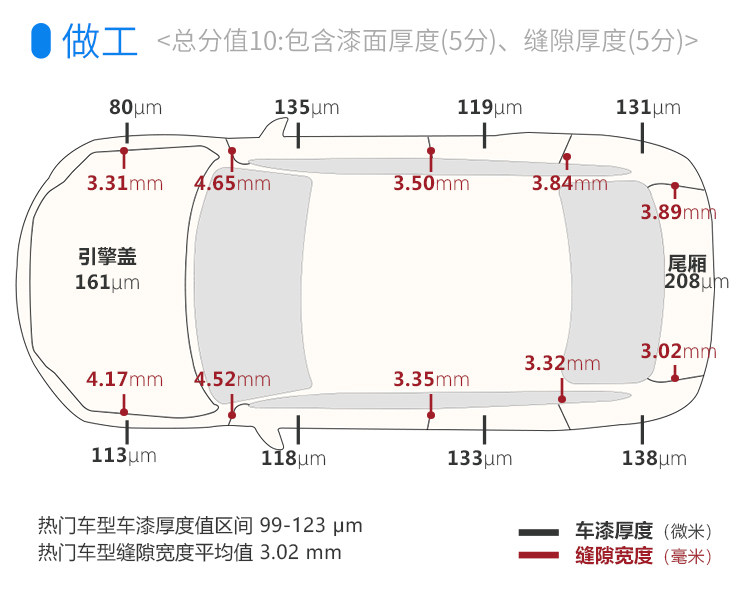 作为日系车来说,逍客的车漆不算薄,大部分都在130μm以上,只不过不是特别均匀,好在落差不大,10μm左右,可以理解;不过车身的间隙确实略大了一点,肉眼看得出偏大,基本都在3.5mm-4mm。