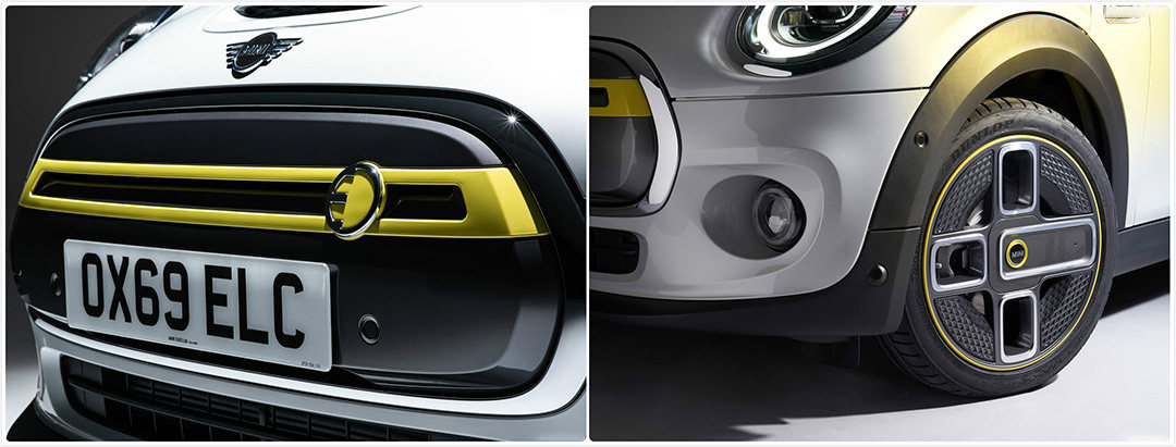 MINI Cooper SE在设计方面与燃油车几乎是如出一辙,经典的两厢三门布局、大圆灯、双色车身以及圆润柔和的线条均能在其身上找寻到痕迹。车侧面的造型还是保持了非常经典的MINI风格,2495mm的轴距与MINI Cooper S完全相同,低趴设计,赋予后视镜上荧光黄色的元素和全新专属的轮毂,在车群里拥有非常高的辨识度。