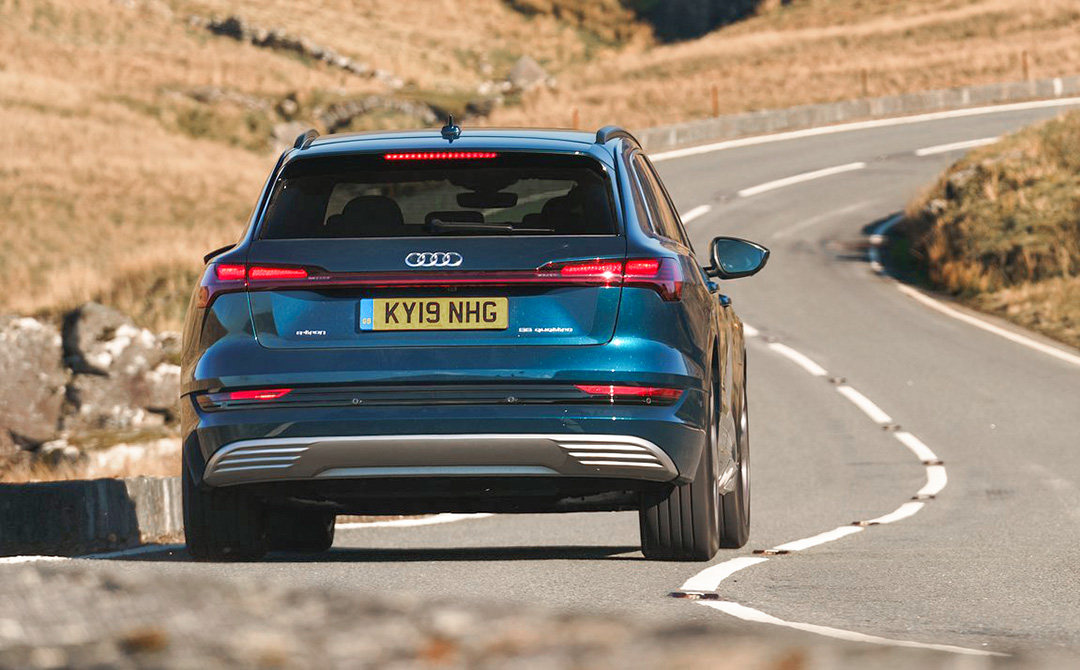侧面的话线条很流畅,撞色系的设计,饱含力量且有底蕴,而旋风式的轮毂、隐藏式的后视镜以及醒目的e-tron logo无时无刻不在提醒着消费者,它是1款纯电动新能源车。可惜的是由于国内法规的原因,隐藏式的后视镜将会取消,改为传统式后视镜。