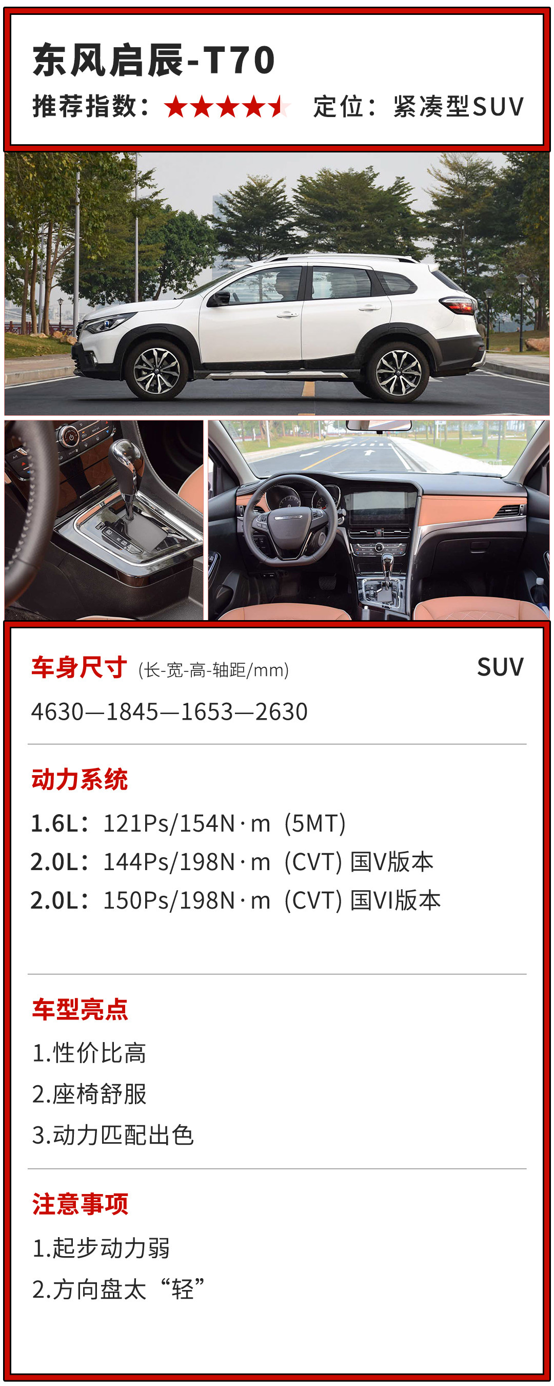 T70从2015年推出至今都保持着不错的销量与口碑,而这一切都来源于可靠的品牌。目前在售的车型分为1.6L和2.0L两种动力,其中1.6L车型只满足国五排放标准,而2.0L则是有国五和国六两种选择,所以在国六标准实施的城市的朋友,就只能选择2.0L了。不过如果让教授推荐,教授也认为2.0L车型才适合这种紧凑型SUV,1.6L开起来总感觉“软绵绵”的。