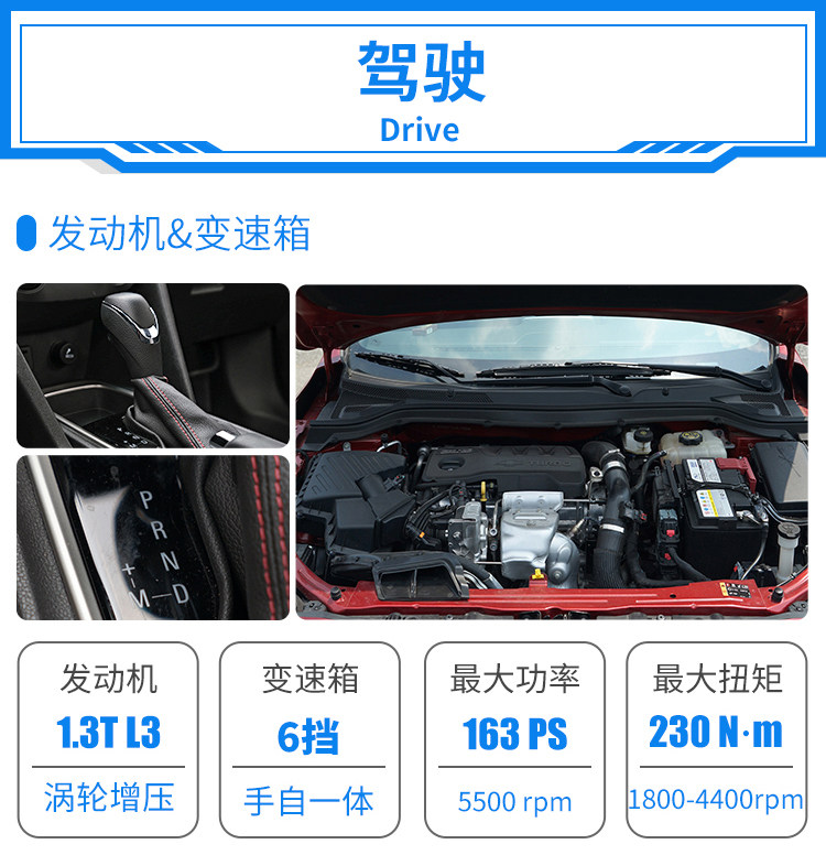 搭载1.3T发动机匹配6AT变速箱,最大马力163匹,动力称得上是充足,中段加速也称得上畅快,动力基本随叫随到,主要是变速箱呈现出成熟大厂应有的水准,换代平顺而响应积极,加上油门响应相对灵敏;但中低速的整体表现则相对平淡,起码要在2000转以上才有更好的动力响应,运动模式权当锦上添花。
