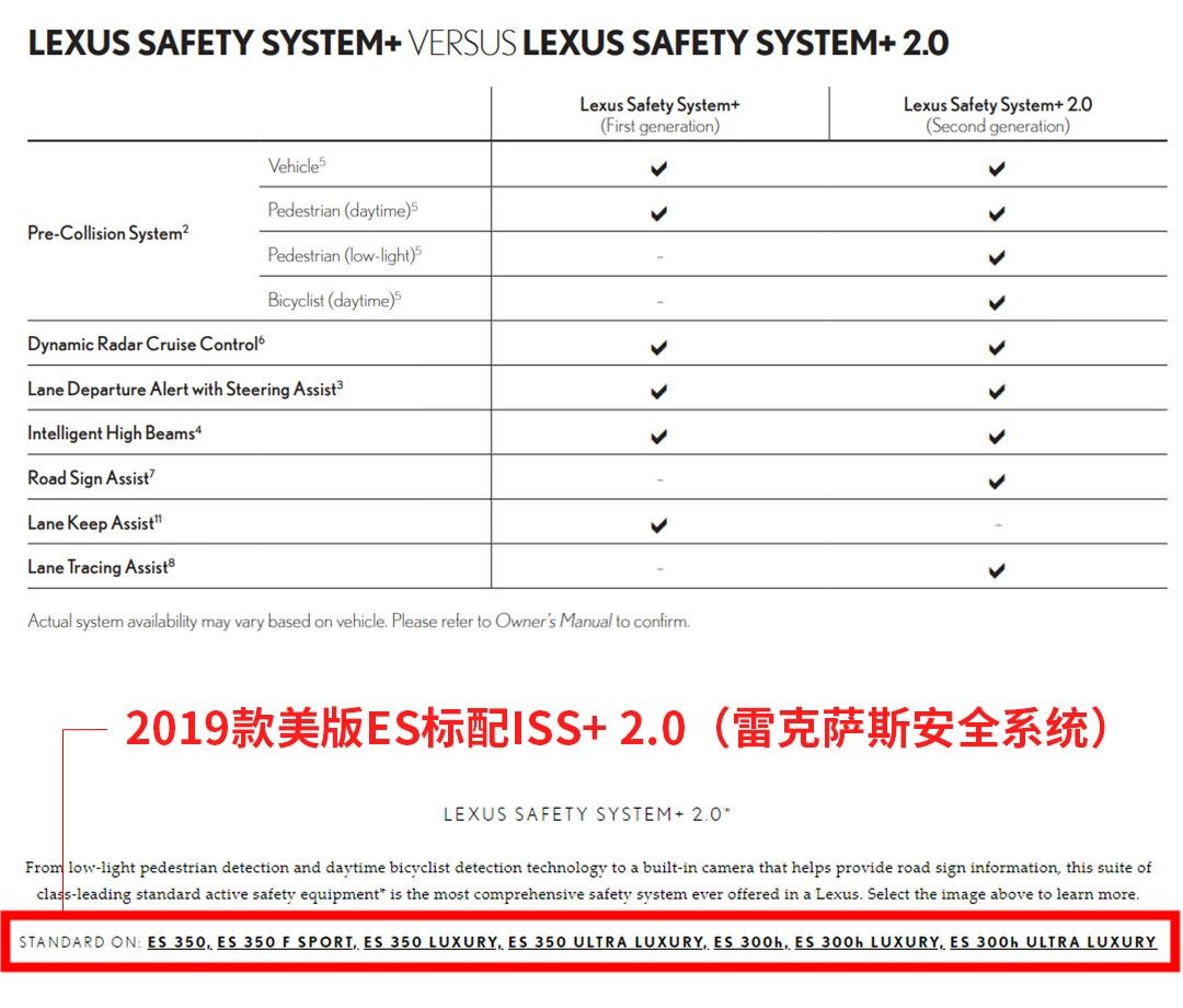 不查不知道一查吓一跳,2019款美版ES原来一直标配ISS+ 2.0(雷克萨斯安全系统),而国内一直是用老旧的ISS+(第一代),国内减配也算了,毕竟这东西也不是同级别都有。
