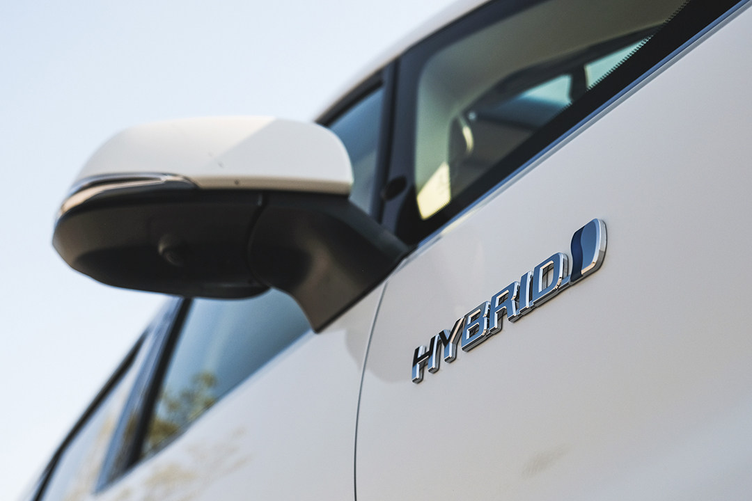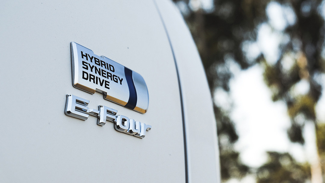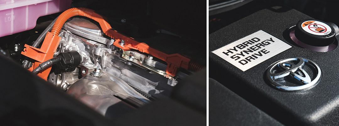 打开引擎盖,看不到预想中的大排量引擎,只有一台小巧的2.5L自然吸气L4引擎,以及由E-CVT变速箱和电动机组成的油电混合动力系统。