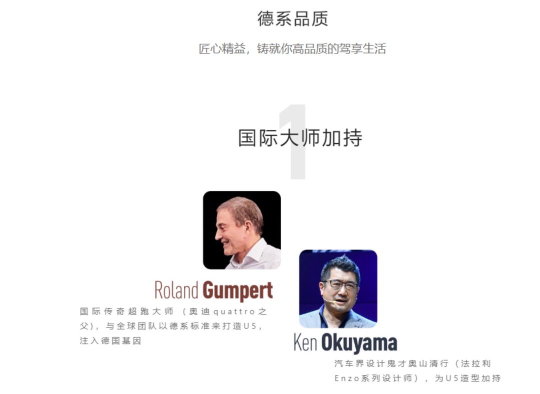 爱驰U5比较引以为豪的是两位大师参与了爱驰U5的调校和设计,其中一人是奥迪Quattro之父——Roland Gumpert,他曾是奥迪的运动部门负责人,领军五年内带奥迪四夺世界拉力赛冠军。另一人是奥山清行,本田NSX和法拉利ENZO均是他的手笔。