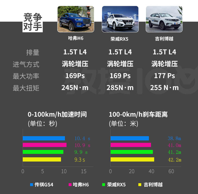 在测试中传祺GS4做出了0-100km/h加速10.4秒的成绩,而在100-0km/h的刹车成绩中,传祺GS4的成绩为38.8m。这两个成绩算可圈可点,制动的水平符合表现,只是加速成绩还有提升的空间。