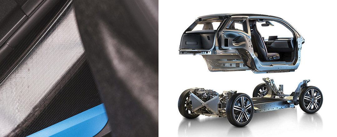 看似弱不禁风的塑料面板之下,隐藏的是碳纤维单体壳式座舱;这是i3实现无B柱车厢的前提,也是i3仅约1.2吨体重的重要基础。