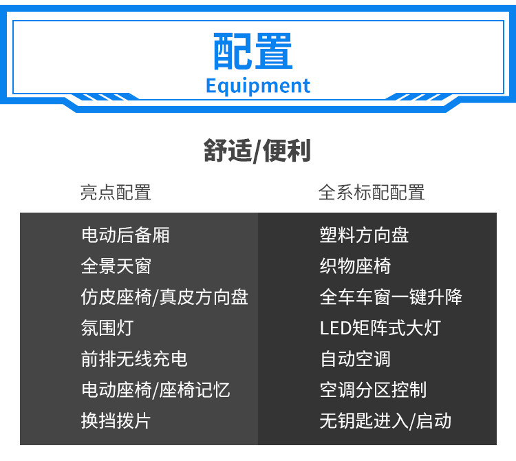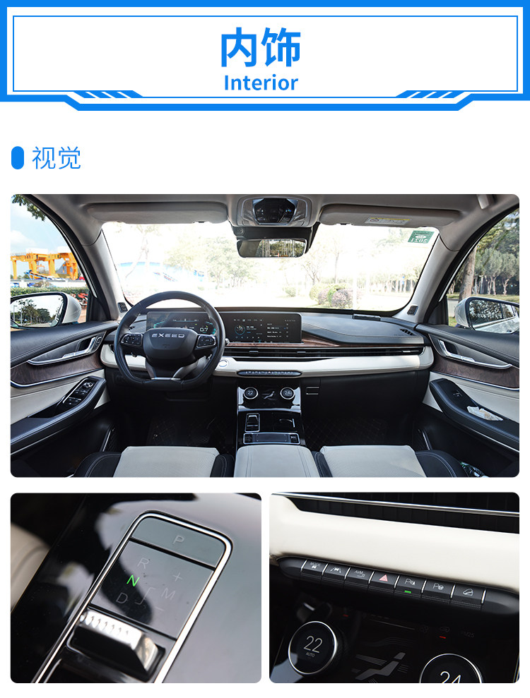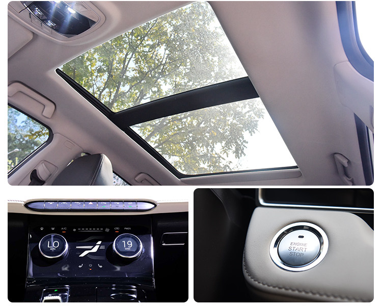 星途LX顶配车型在配置方面令人满意,有全景天窗、真皮座椅,7色氛围灯等配置,且全系标配双区自动空调、无钥匙启动/进入系统。