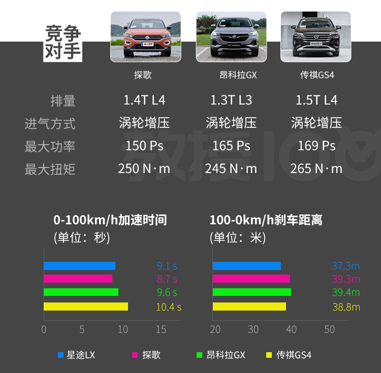 星途LX身上搭载的是奇瑞第三代ACTECO系列发动机,最高热效率高于上一代1.5T的37.1%,升功率和升扭矩都有大幅度提升。星途LX的官方百公里加速时间为8.8秒。