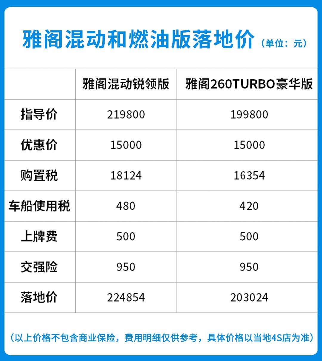 我们选取了配置基本相同的雅阁锐·混动2.0L锐领版(以下简称雅阁混动)和雅阁260TURBO豪华版(以下简称雅阁燃油版)两款车型,他们的售价分别为21.98万元和19.98万元,售价上相差了2万元。当然车子要开上路,还有购置税、保险等开支,所以购车花多少钱,还要看最终的落地价。