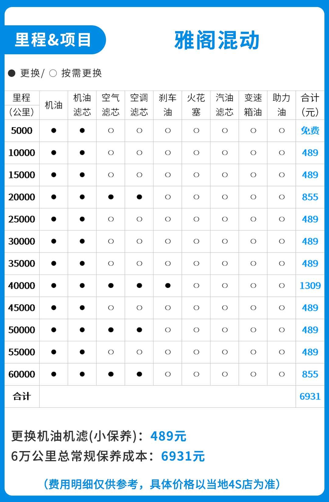 根据计算,雅阁混动3年6万公里的保养费用为6931元,每年平均2310元,公里平均0.115元。