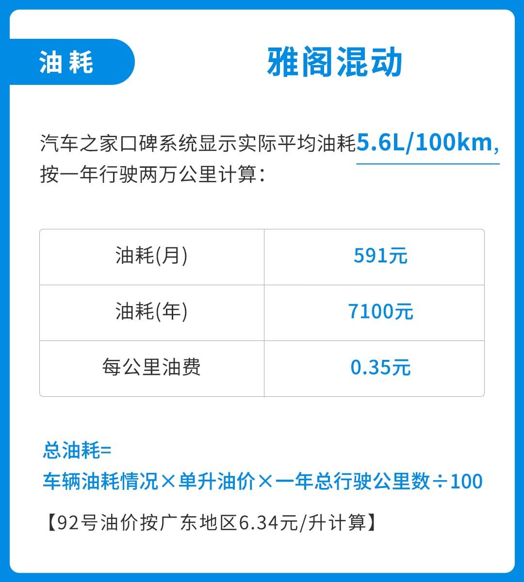 我们从汽车之家车主口碑处了解到,雅阁混动的车主平均油耗为5.6L/100km,按目前广东地区92号油6.34元/升的价格来计算,一年行驶2万公里的总油费约为7100元,每公里平均0.355元
