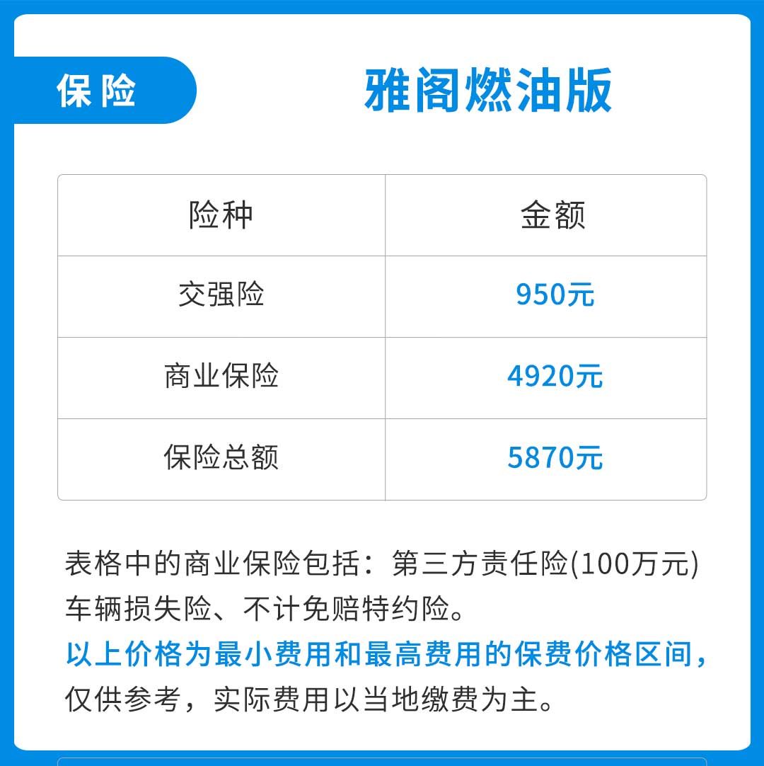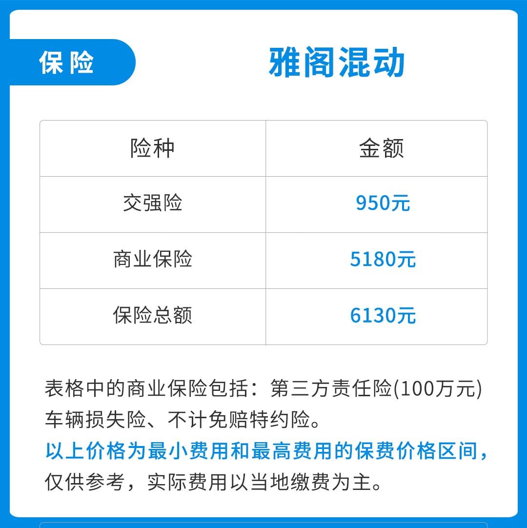 雅阁锐·混动2.0L锐领版的官方指导价为21.98万,目前终端有1.5万元的优惠,所以按照20.48万的裸车价来计算,雅阁混动一年的保险费用约为6130元。