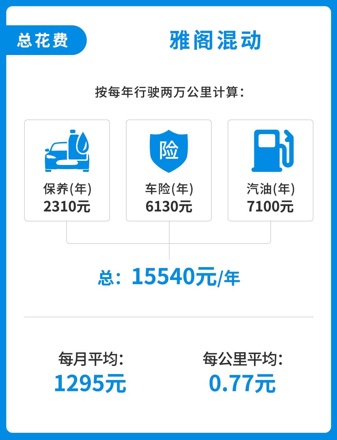综上来看,按一年行驶2万公里来计算,雅阁混动一年的保养费、保险和油费分别为2310元、6130和7100元,一年的养车总费用大概15540元,每月平均约为1295元,每公里平均约0.77元。