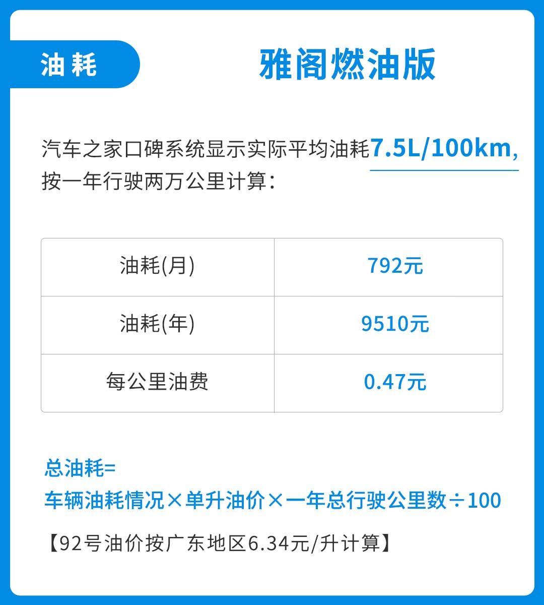 我们从汽车之家车主口碑处了解到,雅阁燃油版的车主平均油耗为7.5L/100km,按目前广东地区92号油6.34元/升的价格来计算,一年行驶2万公里的总油费约为9510元,每公里平均0.475元