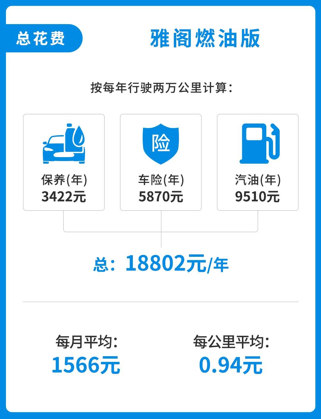 综上来看,按一年行驶2万公里来计算,雅阁燃油版一年的保养费、保险和油费分别为3422元、5870和9510元,一年的养车总费用大概18802元,每月平均约为1566元,每公里平均约0.94元。