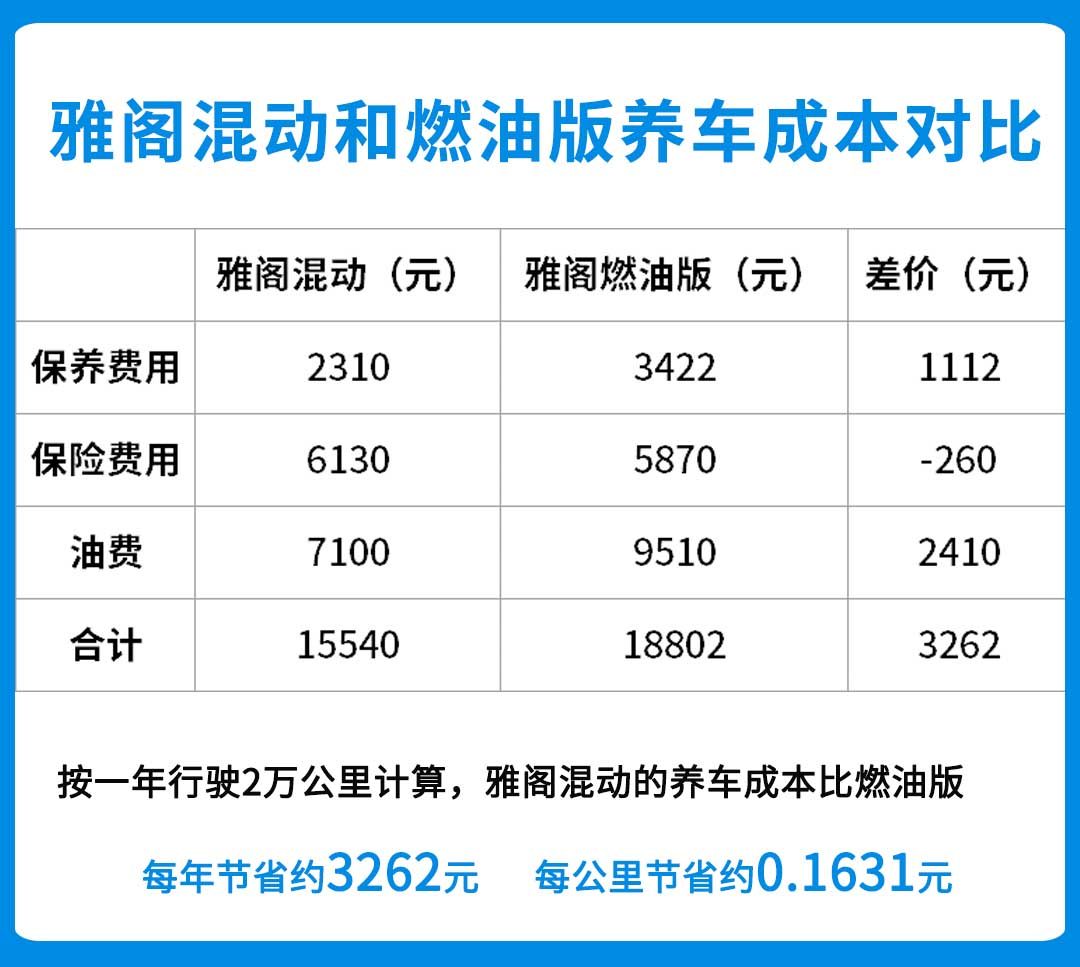 综上来看,按照一年行驶2万公里计算,雅阁混动的养车成本约为15540元,而雅阁燃油版的养车成本约18802元,所以雅阁混动比雅阁燃油版一年节省约3262元,每公里节省约0.16元。