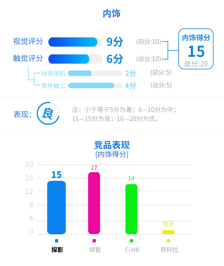 内饰小结:探影的内饰视觉效果非常出色,与车身同色的饰板大幅提升了车厢的年轻感、时尚感;但作为一台顶配车型,依然在内饰中使用大量触感一般的硬塑料部件,恐怕会让一些消费者感到失望。